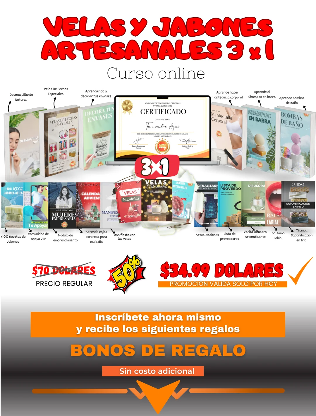 🔴Además, te daremos un pack de libros electrónicos, clases adicionales, sesiones en vivo y un grupo exclusivo que te será de gran ayuda para que puedas aprender más de las velas y jabones artesanales.